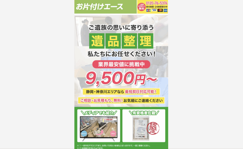 複数のメディアで掲載されている、有名な遺品整理業者です。価格も相場料金で利用しやすく、初めて遺品整理を依頼したい人におすすめです。