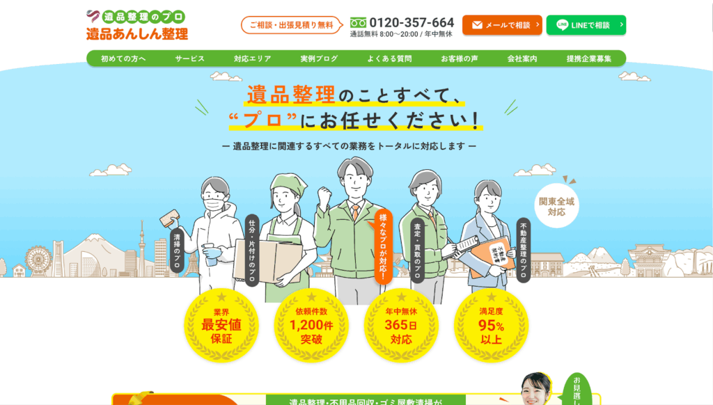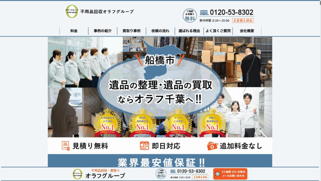 「遺品あんしん整理」は、船橋市を含む千葉県全域にきめ細かく対応しており、年中無休で相談できる利便性が強みです。