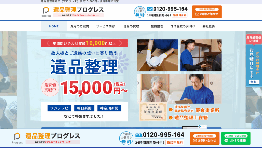「遺品整理プログレス」は24時間365日受付の体制が整っており、船橋市にも迅速に向かえる広い対応力が魅力です。