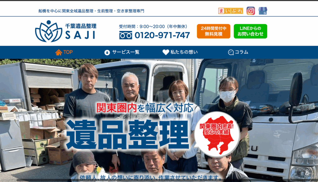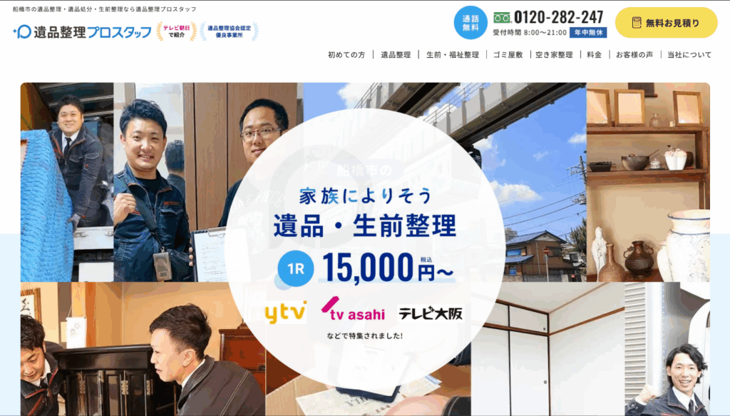 「遺品整理プロスタッフ千葉」は、船橋市を含む広いエリアに年中無休で対応しており、8時から21時まで相談できる利便性が大きな強みです。