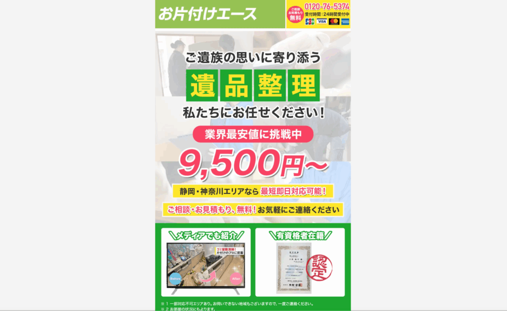 お片付けエースは掛川市を含む静岡・神奈川エリアに対応する遺品整理業者です。