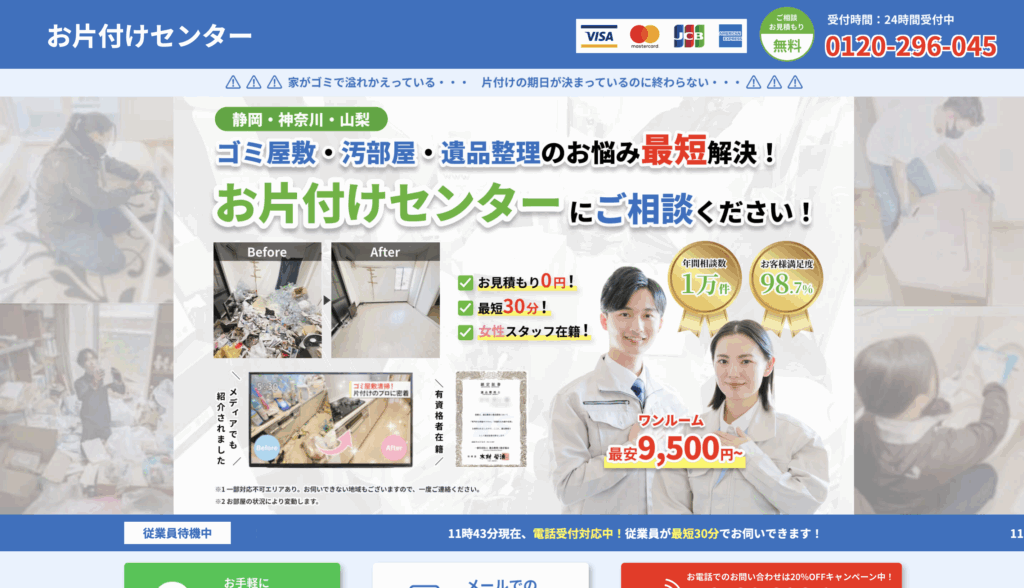 24時間受付で依頼可能で、1R9,500円〜、1DK〜1LDK29,000円〜など規模に応じた明確な料金設定が特徴です。