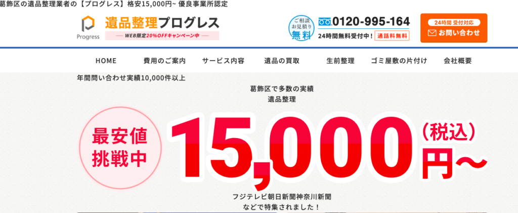 年間問い合わせ件数10,000件以上で実績が豊富な遺品整理業者です。公式サイトでは20%オフのクーポンが発行されています。