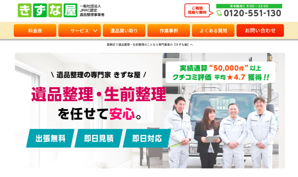 実績通算50,000件以上で、口コミ評価平均4.8の満足度が高い遺品整理業者です。公式サイトでは遺品整理スタッフのブログが公開されており、人柄もよくわかります。