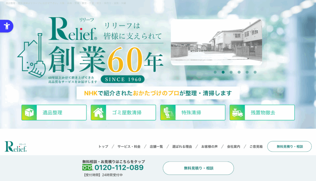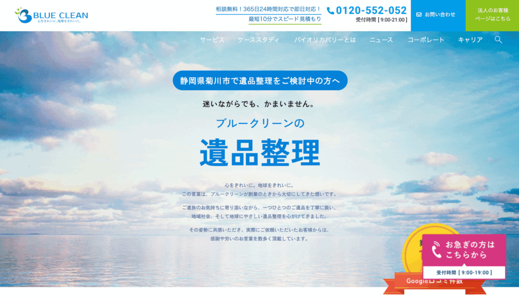 菊川市でも利用できる「BLUE CLEAN」は、受付時間が9:00〜21:00で、幅広いエリアに対応する遺品整理業者です。