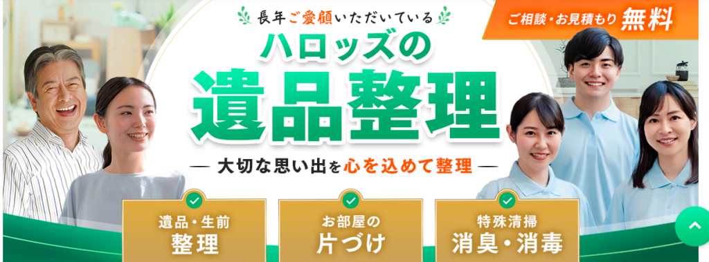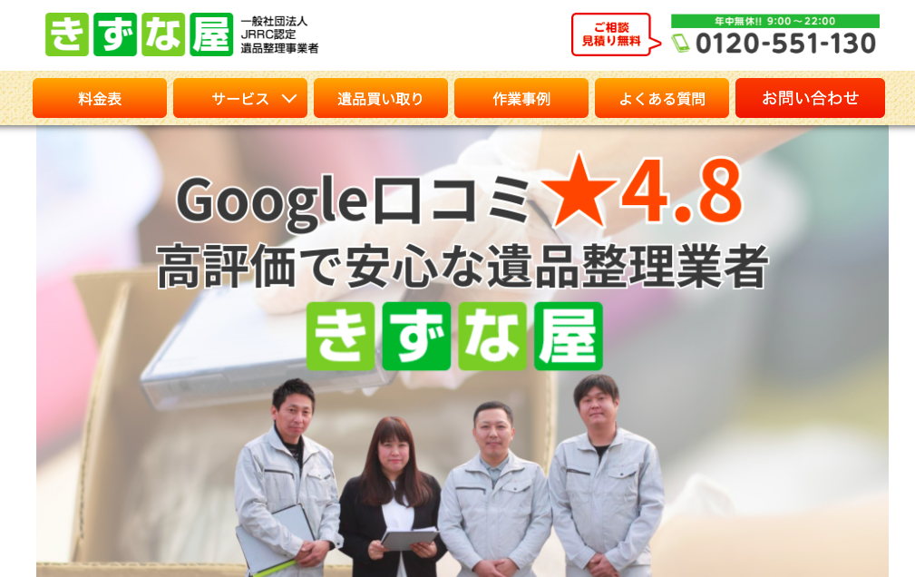 実績通算50,000件以上で、口コミ評価平均4.8の満足度が高い遺品整理業者です。遺品整理だけでなく、生前整理や特殊清掃、クリーニング、遺品の査定、不動産整理にも対応してくれます。