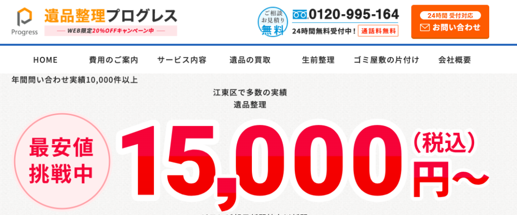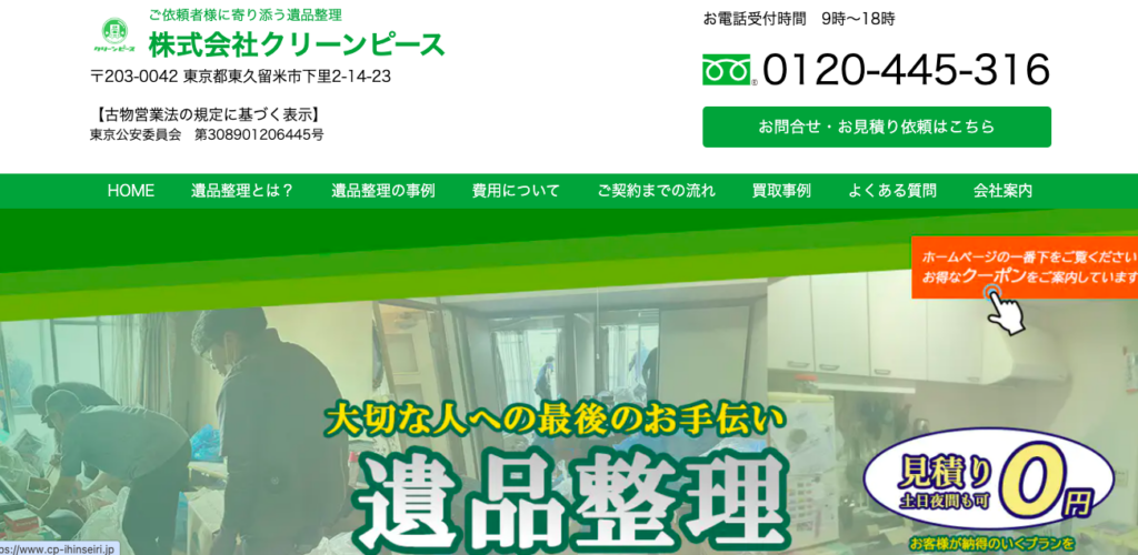 年間問い合わせ件数10,000件以上で実績が豊富な遺品整理業者です。日時指定が可能で、遠方の人も立ち会いなしの作業ができます。