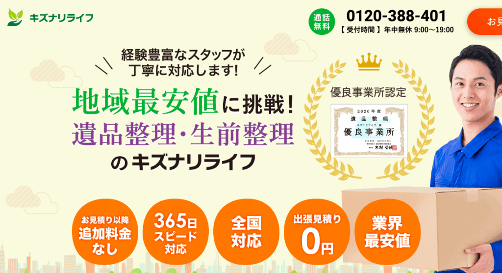 優良事業所に認定されている、遺品整理業者です。年中無休で全国対応しているので、日にちの相談にも柔軟に対応してくれます。