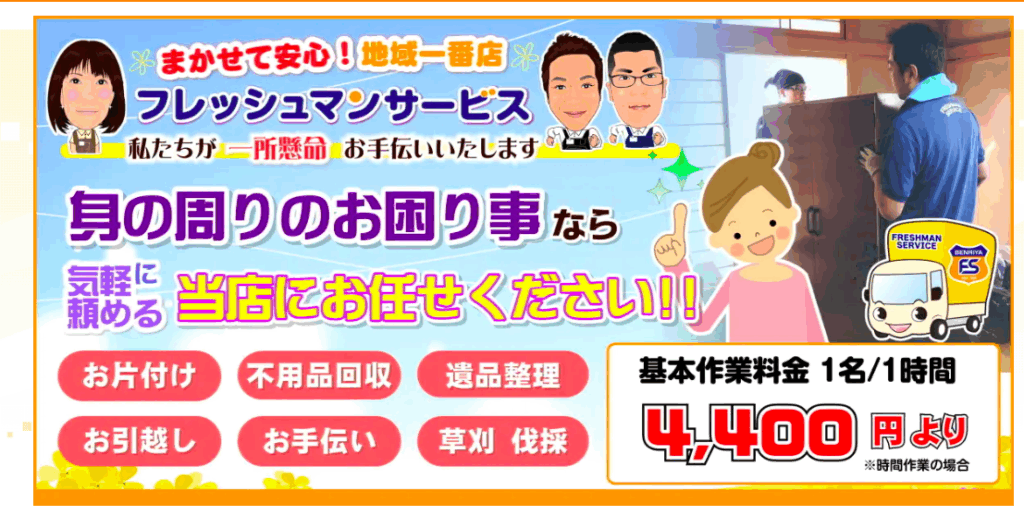 遺品整理はもちろん、便利屋のサービスも提供している専門業者です。開業16年目で実績も豊富。草刈りや引越しなども対応できます。