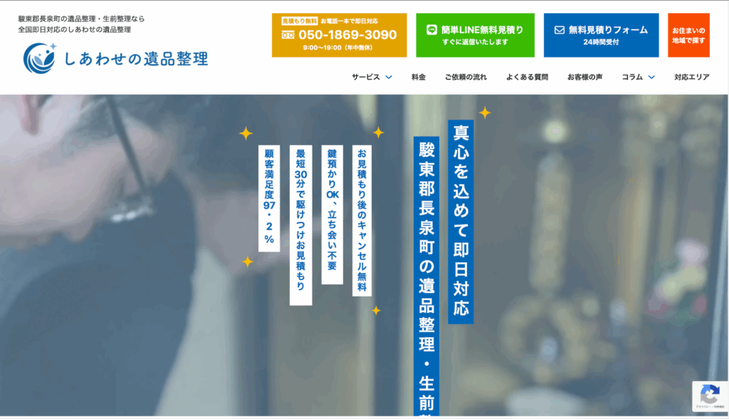 年中無休で9:00〜19:00まで対応しており、故人の思い出や大切な品を丁寧に扱いながら整理を進めてくれます。