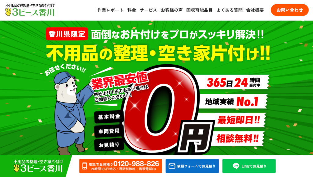 3ピース香川は、積載量ごとに細かく区分したパック料金を採用している不用品回収業者です。