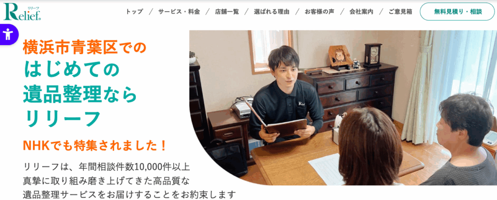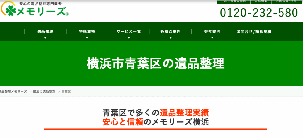 横浜市青葉区に地域密着の遺品整理サービスを提供している専門業者です。見積り後の追加料金なし、365日対応、キャンセル料0円など安心をモットーにしており、初めてでも依頼しやすくなっています。