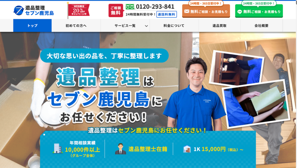 セブン鹿児島は、遺品整理から仕分け、搬出、不用品処分、貴重品探索まで一括で対応できる業者です。