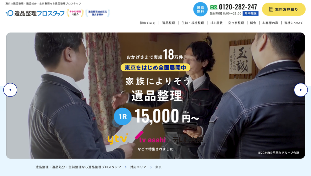 集合住宅や戸建てなど住環境に応じた整理にも対応し、間取り別の料金目安を示しているため、費用感を把握したうえで相談しやすい業者です。